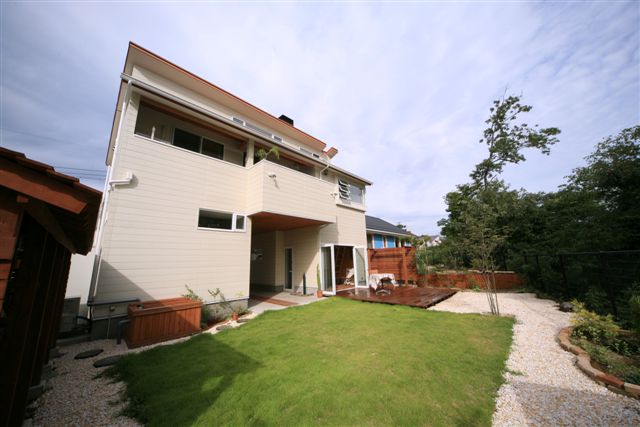 高台に建てられ、家の表中央からピロティ-を貫けると南面には気持ちのいい芝の庭が広がる。
